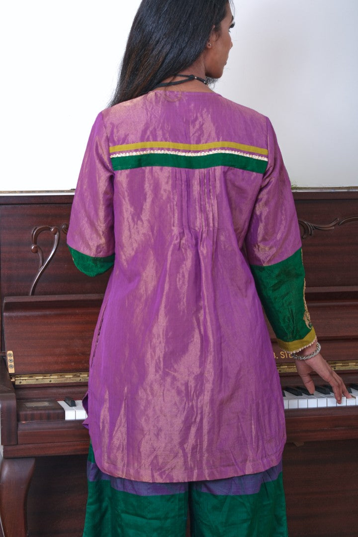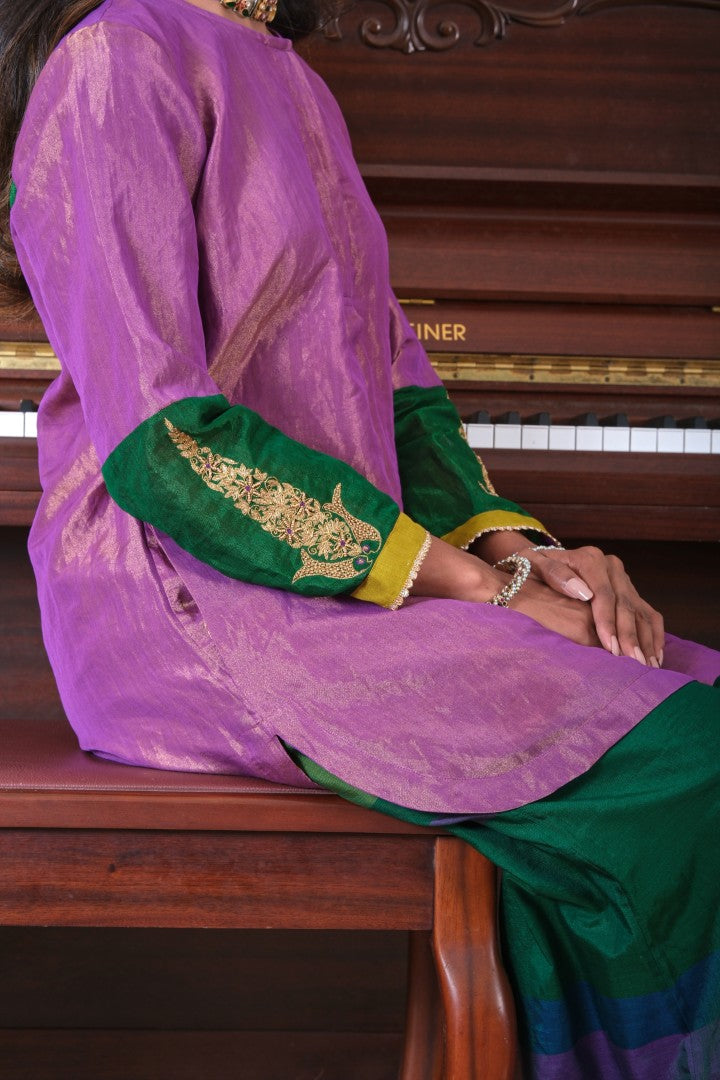 Perfect for weddings, cultural gatherings, or evening celebrations, this festive set blends traditional craftsmanship with modern design. The lightweight tissue fabric offers a subtle sheen, while the silk pants provide comfort and sophistication, making it a timeless addition to your contemporary Indian wear collection."