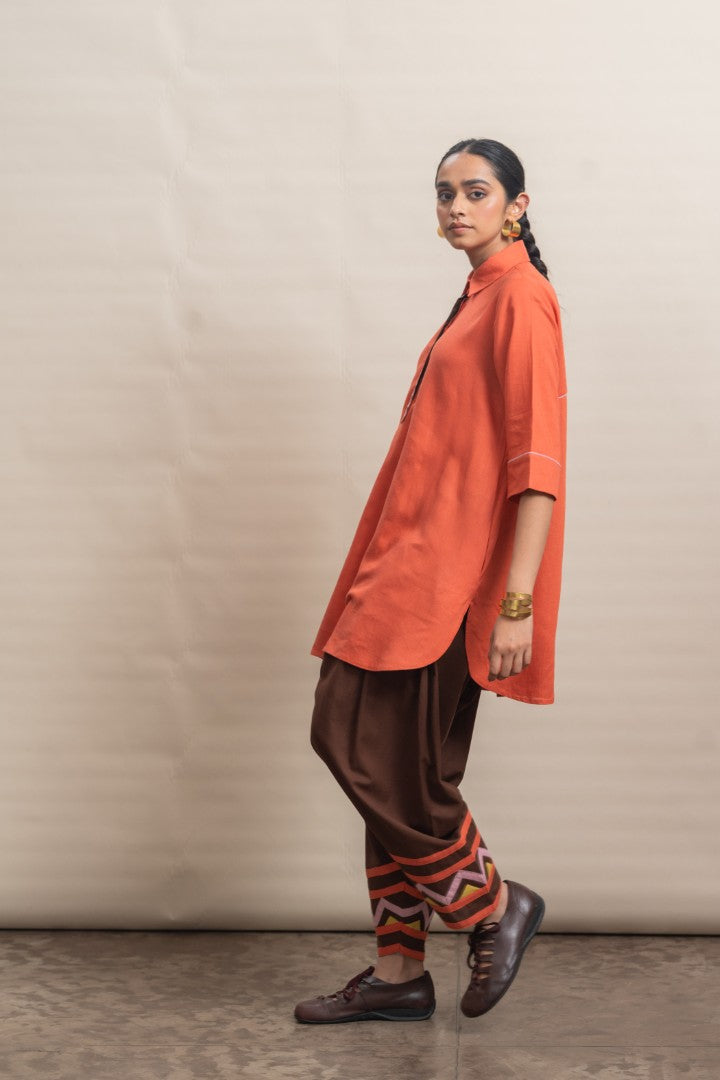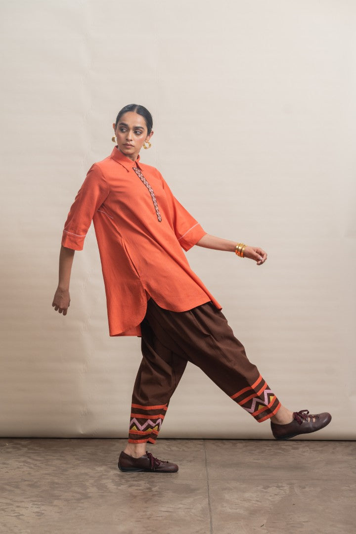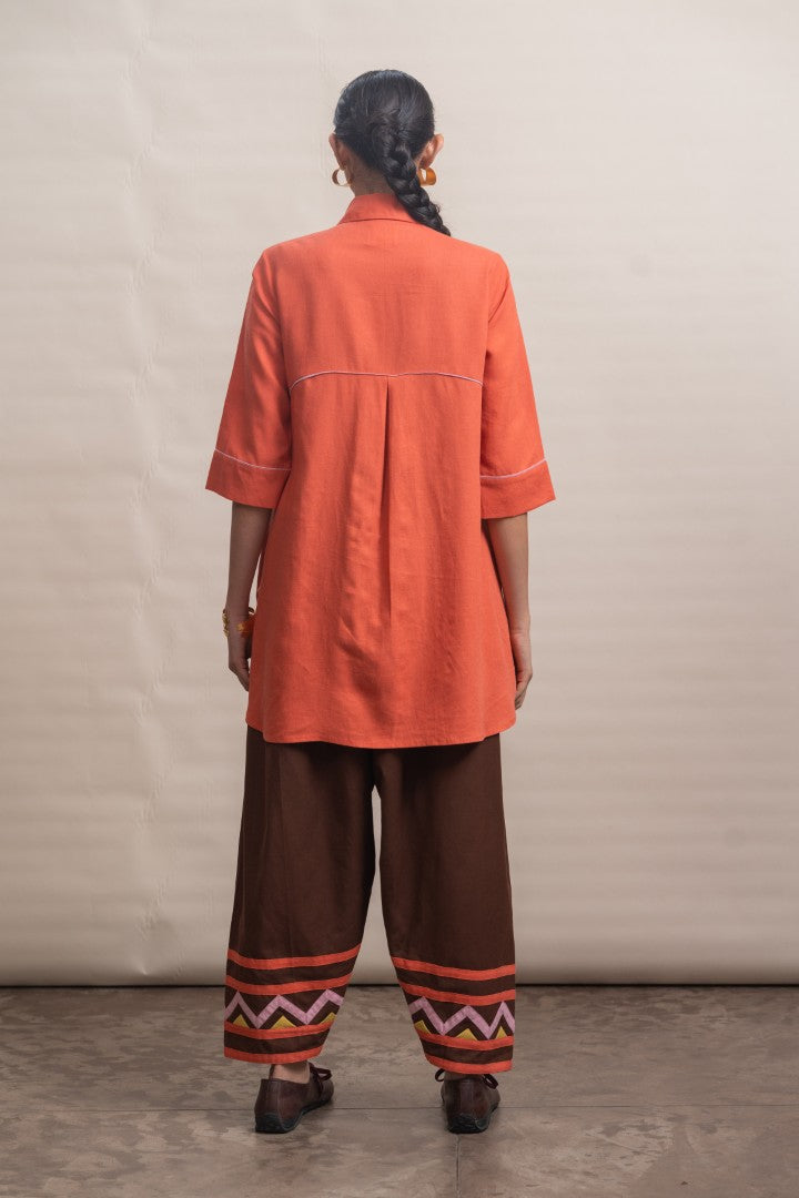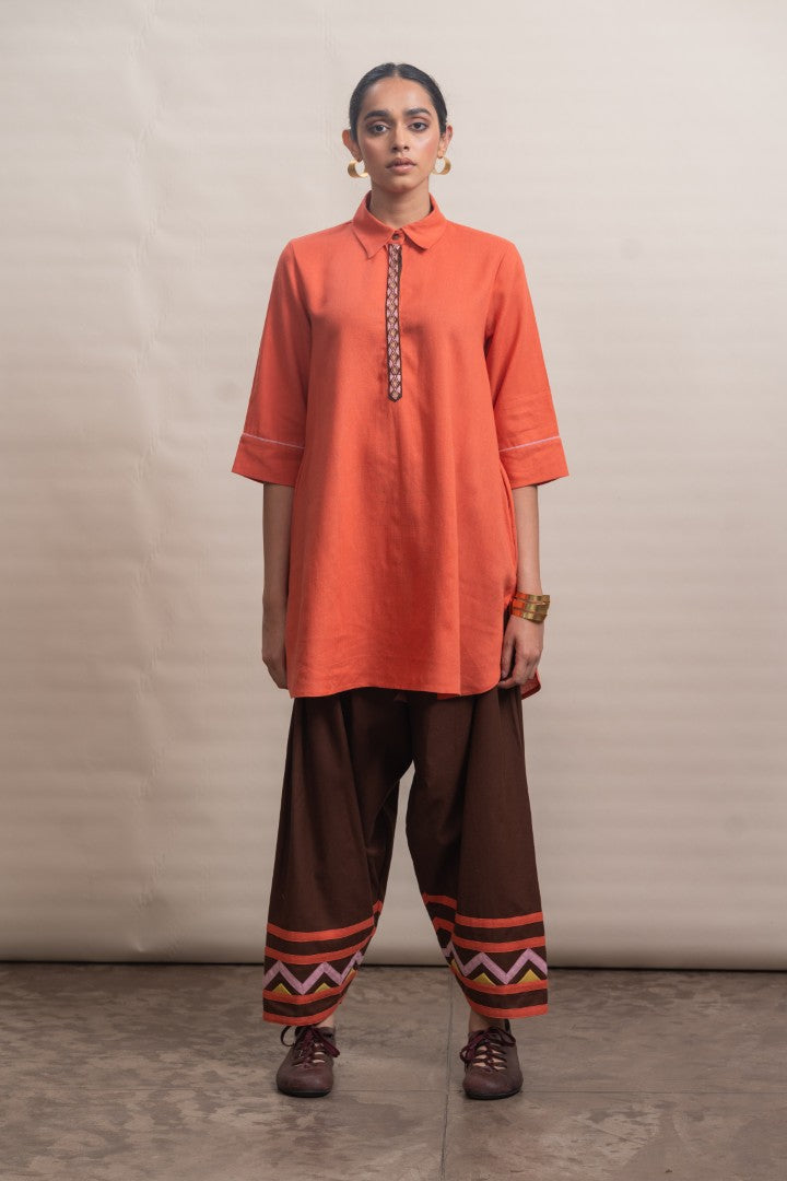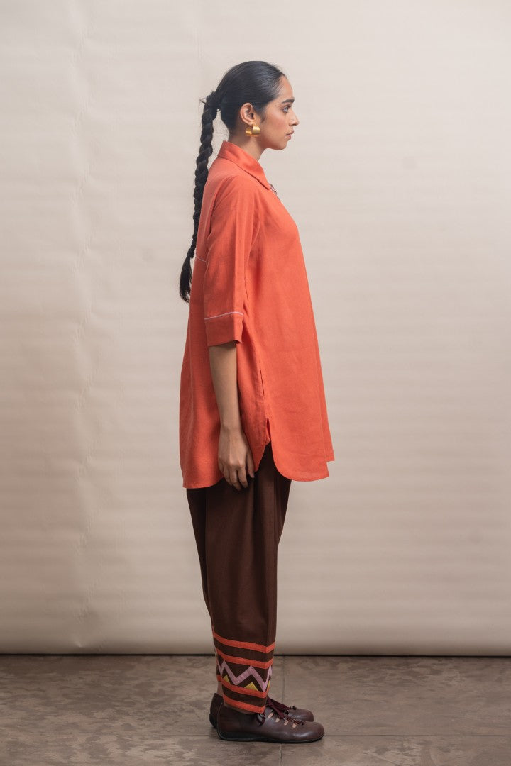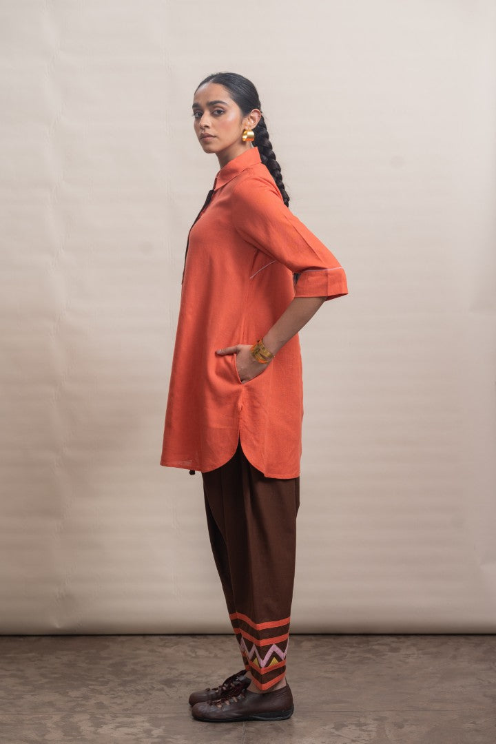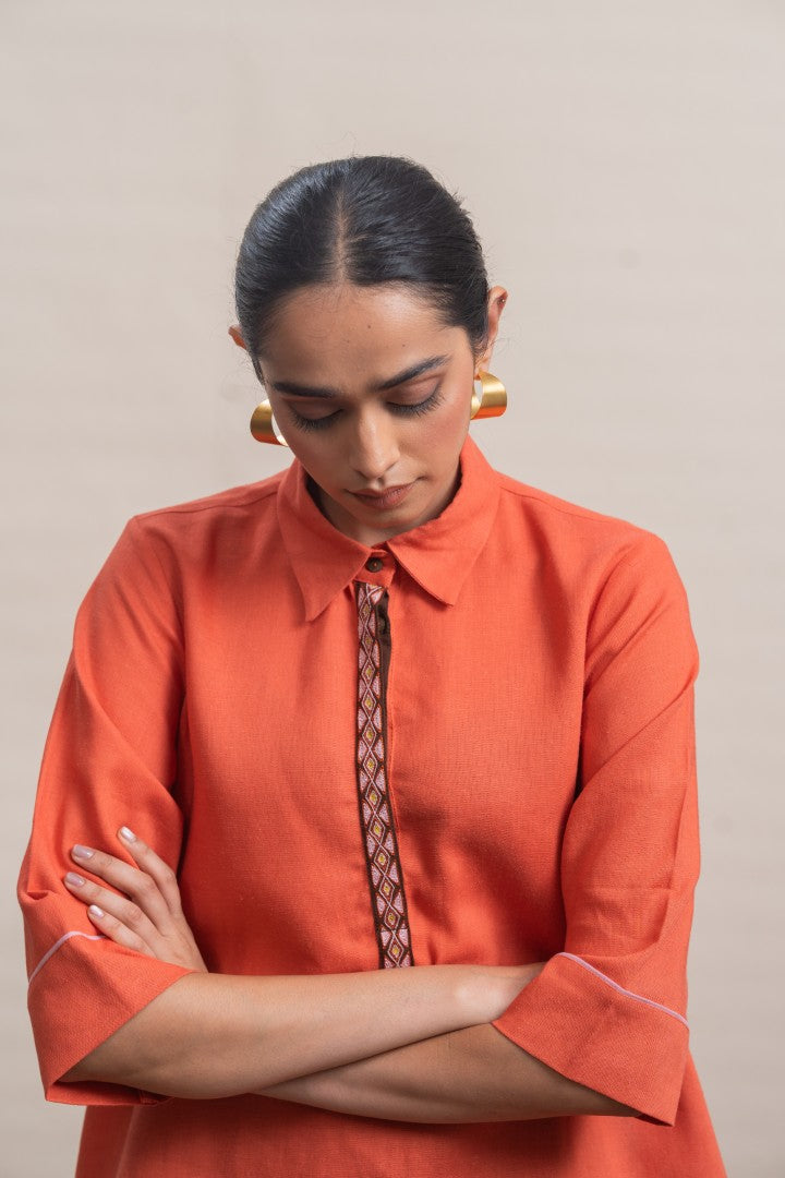 Crafted in a breathable linen-cotton blend, this tunic is designed for effortless everyday elegance. The silhouette is clean and relaxed, elevated by a hand-embroidered placket that adds a quiet artisanal accent. Subtle contrast piping along the sleeves brings a hint of definition without overpowering the design. Lightweight, natural, and thoughtfully detailed, this piece balances comfort with understated craft.