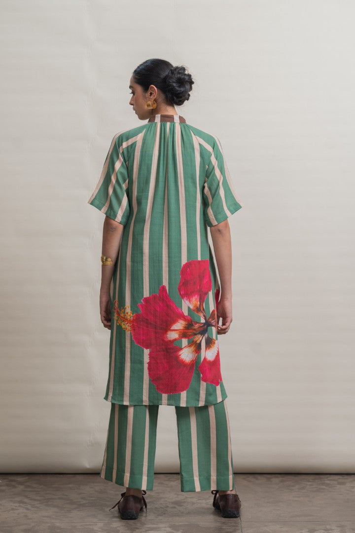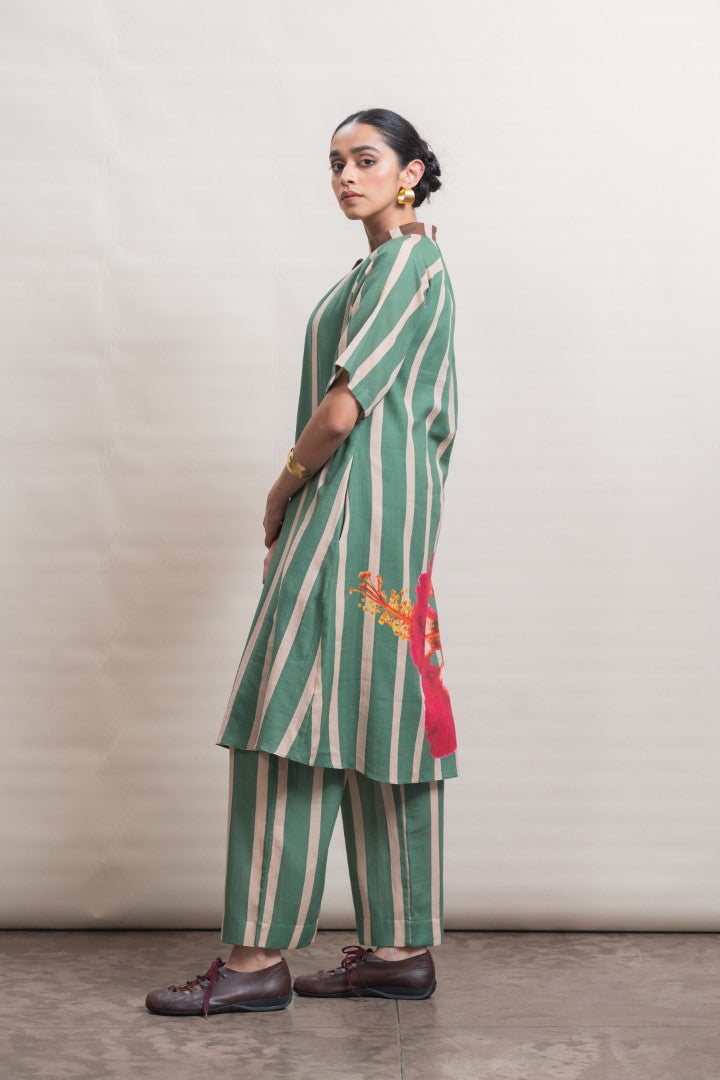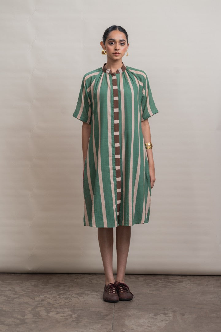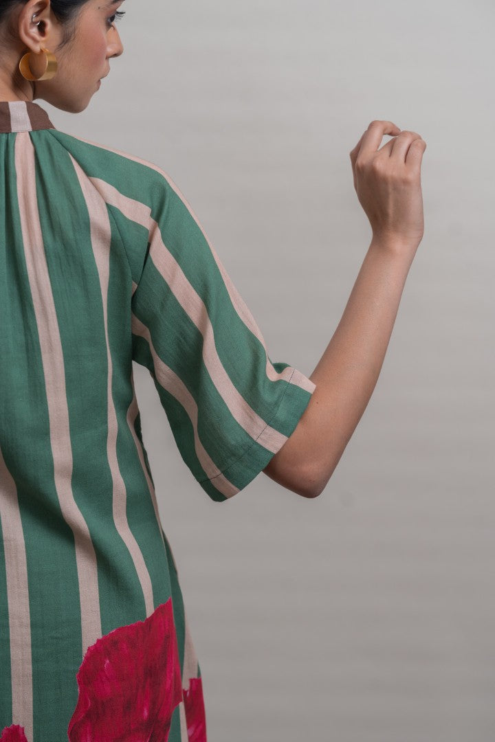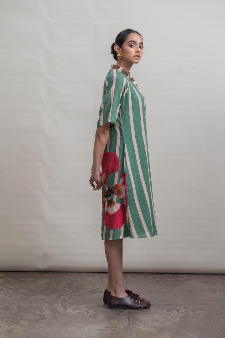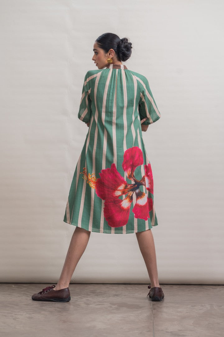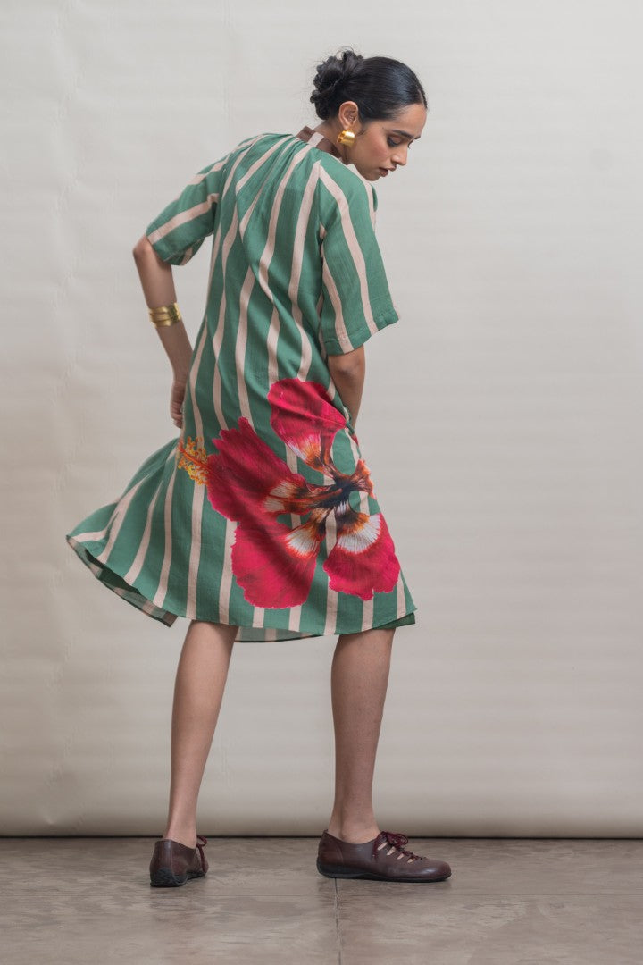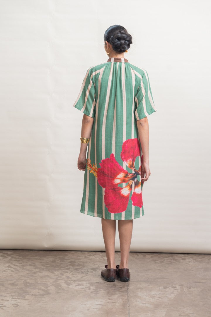 A refined shift dress crafted in lightweight cotton, defined by elongated vertical stripes that lend a sense of ease and proportion. Raglan-cut short sleeves create a fluid, relaxed silhouette, complemented by soft gathers at the neckline for gentle volume. A contrast striped placket introduces subtle graphic interest, while a hand-painted hibiscus motif print at the back hem adds an expressive, artisanal finish. Designed for effortless wear, this piece balances structure with softness, making it a modern wardrobe essential.
