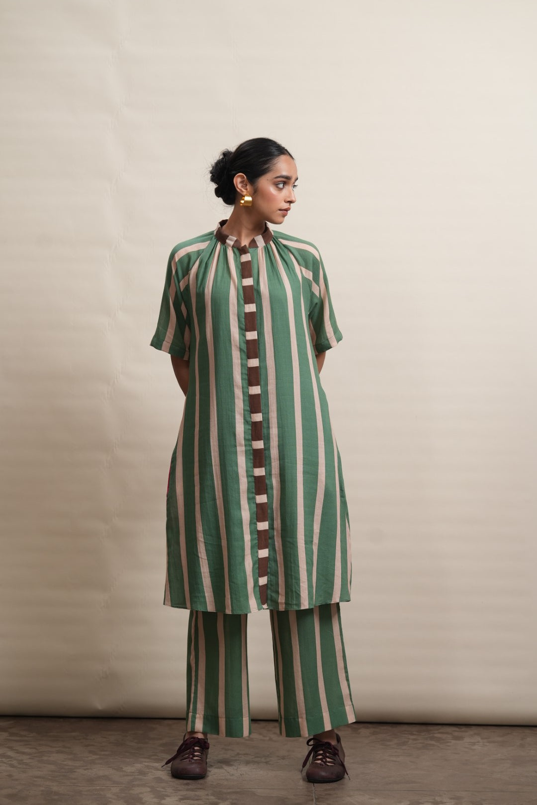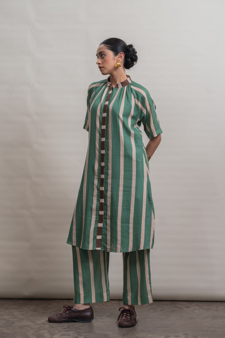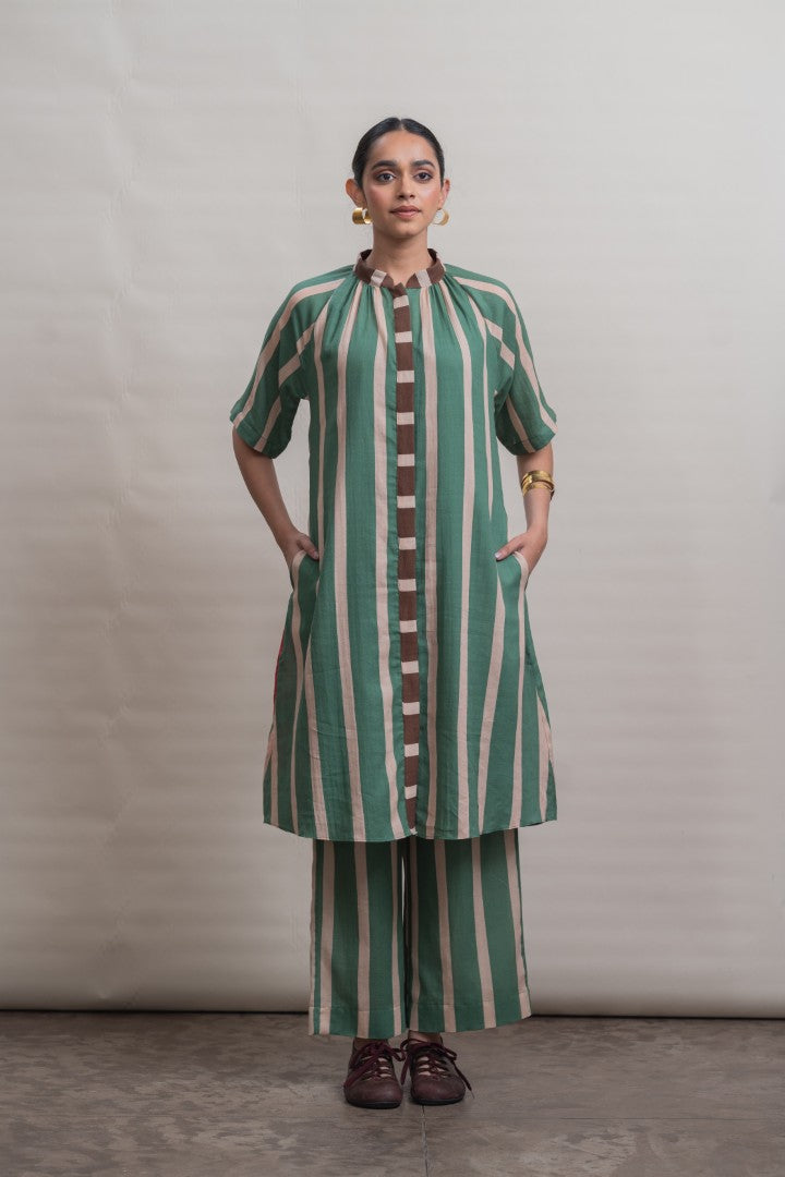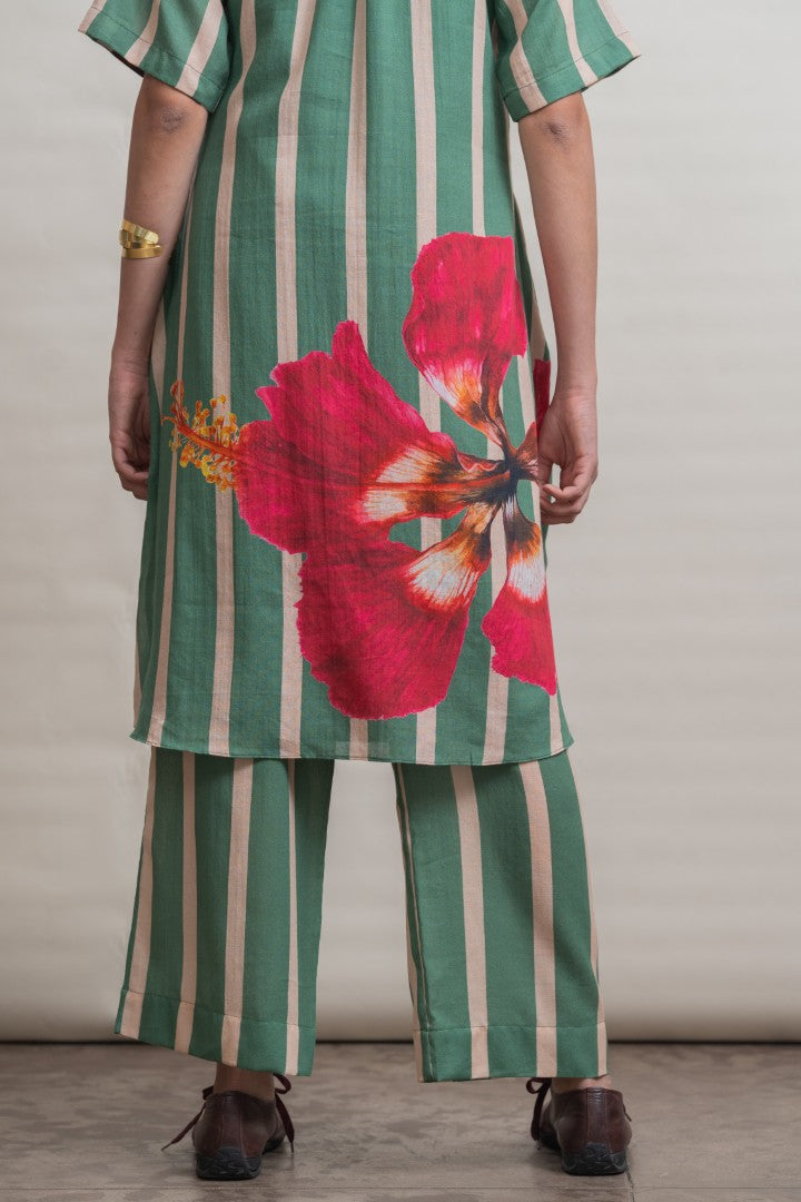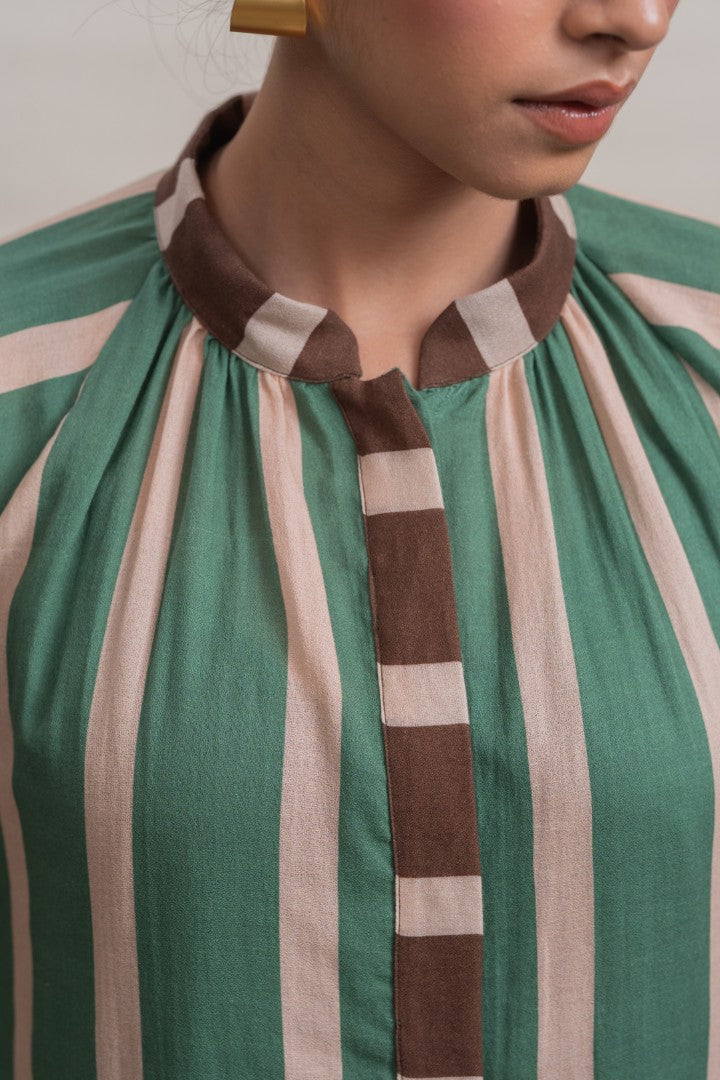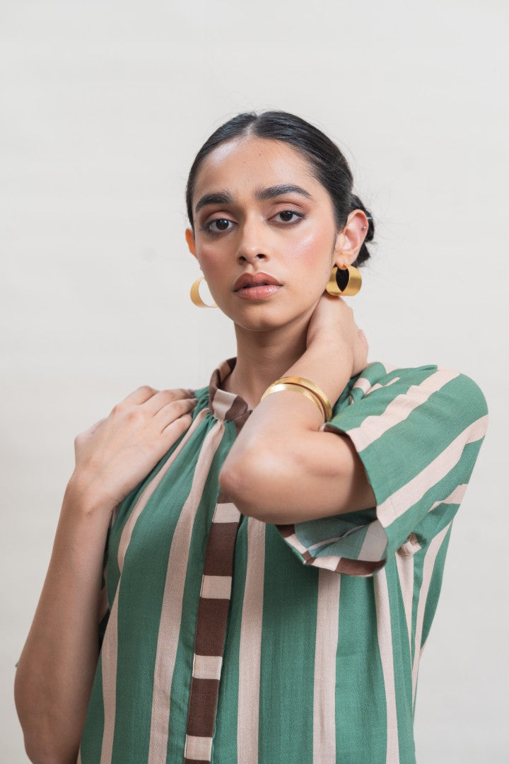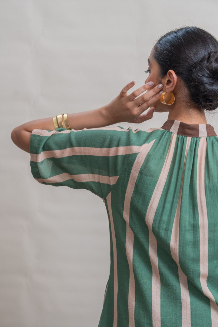 A refined shift dress crafted in lightweight cotton, defined by elongated vertical stripes that lend a sense of ease and proportion. Raglan-cut short sleeves create a fluid, relaxed silhouette, complemented by soft gathers at the neckline for gentle volume. A contrast striped placket introduces subtle graphic interest, while a hand-painted hibiscus motif print at the back hem adds an expressive, artisanal finish. Designed for effortless wear, this piece balances structure with softness, making it a modern wardrobe essential.