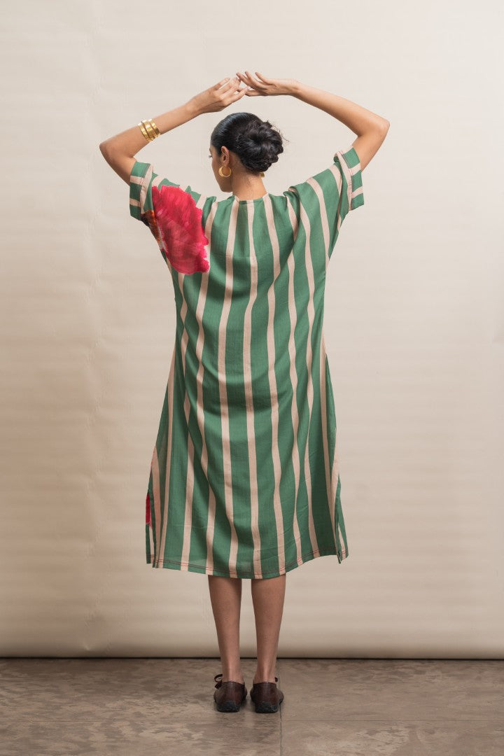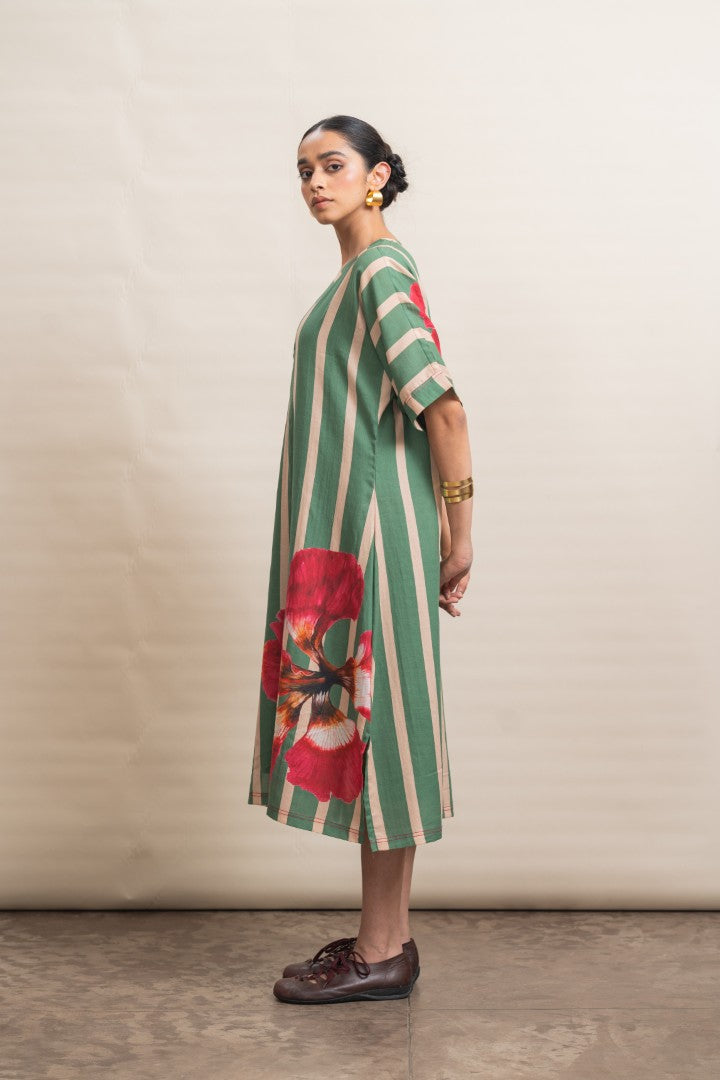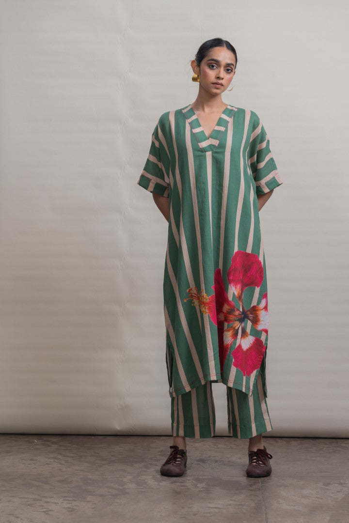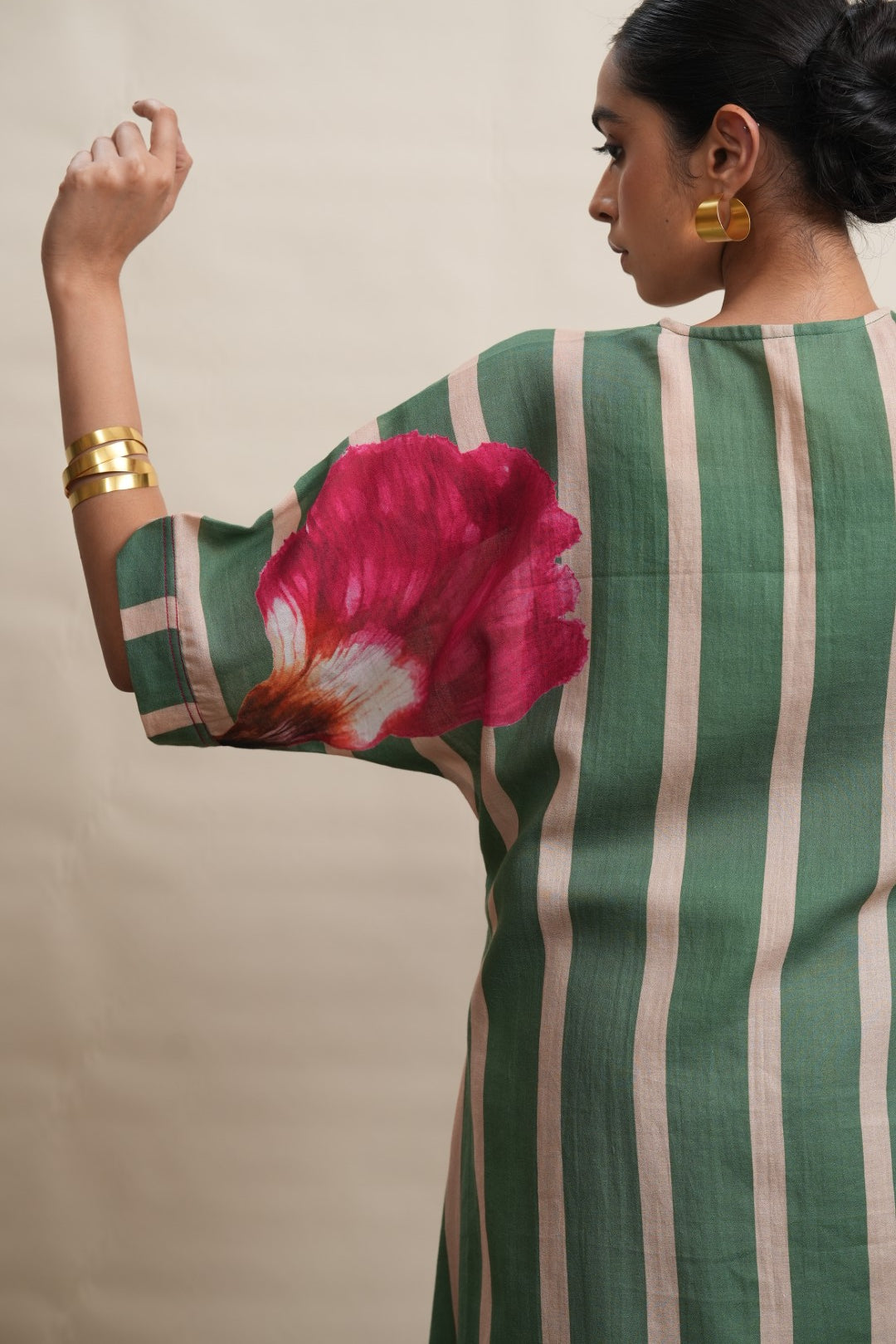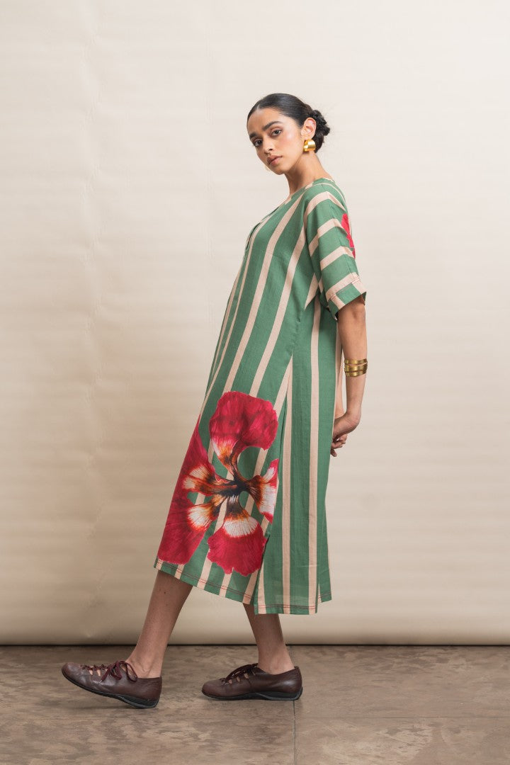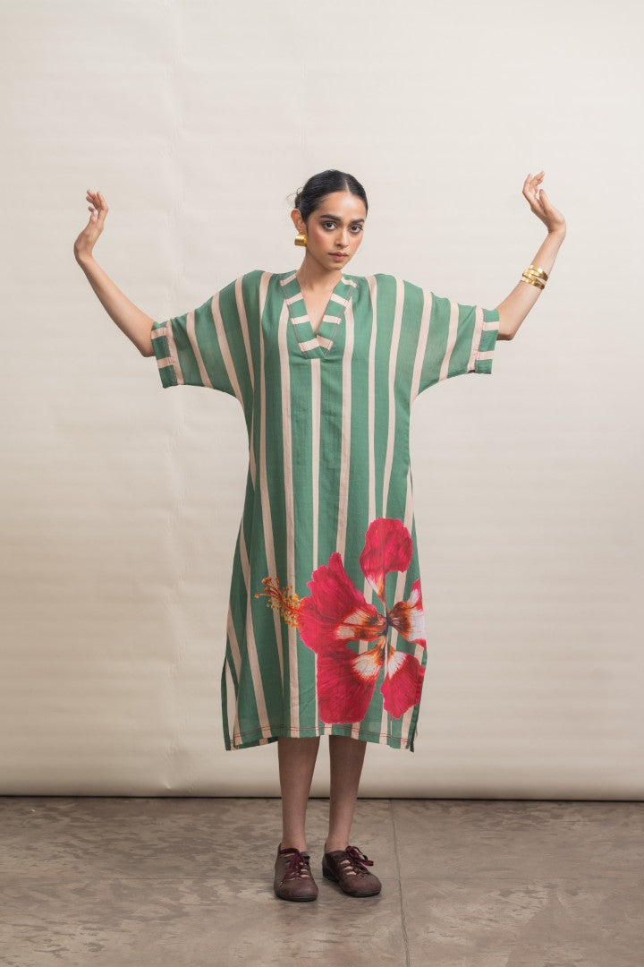 Ruth dress: This kaftan dress is crafted in soft moss cotton, featuring a striped base highlighted with a hand-painted hibiscus print. Designed for an easy, fluid drape, it comes with a separate under slip for comfort and coverage.