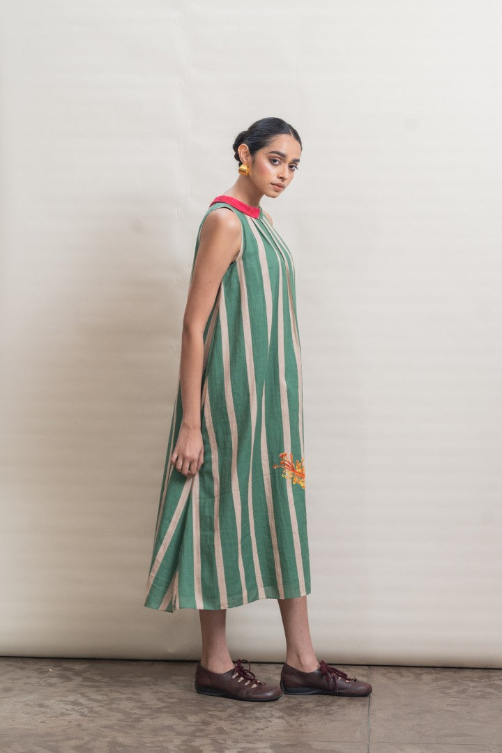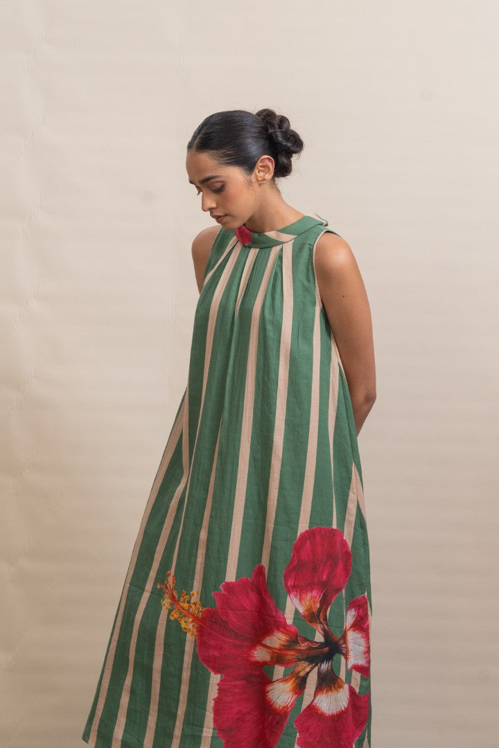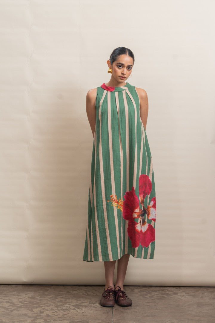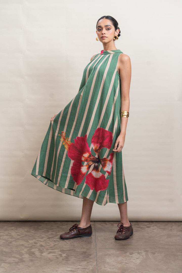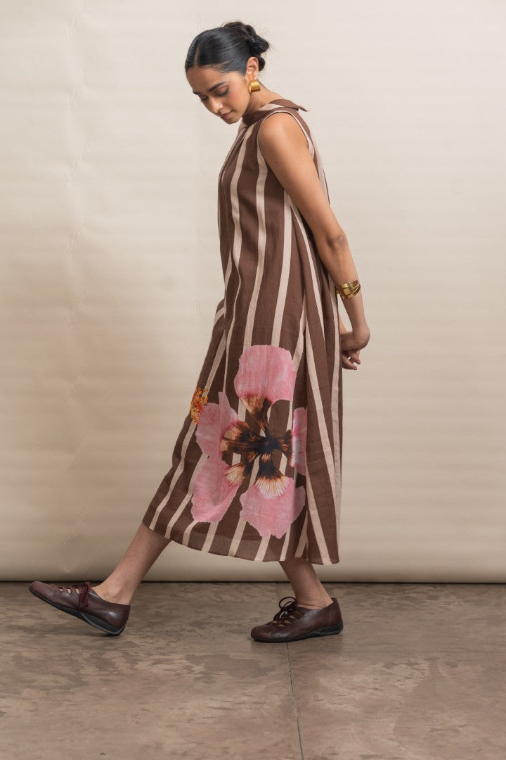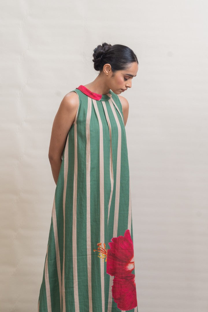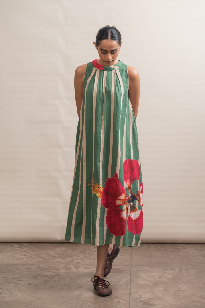 Sleeveless midi dress in soft cotton with vertical stripe placement for a lengthened silhouette. Features a relaxed A-line fall and a hand-painted floral motif print placed at the hem. Finished with a rolled collar and back closure,this dress makes a statement in understated elegance.