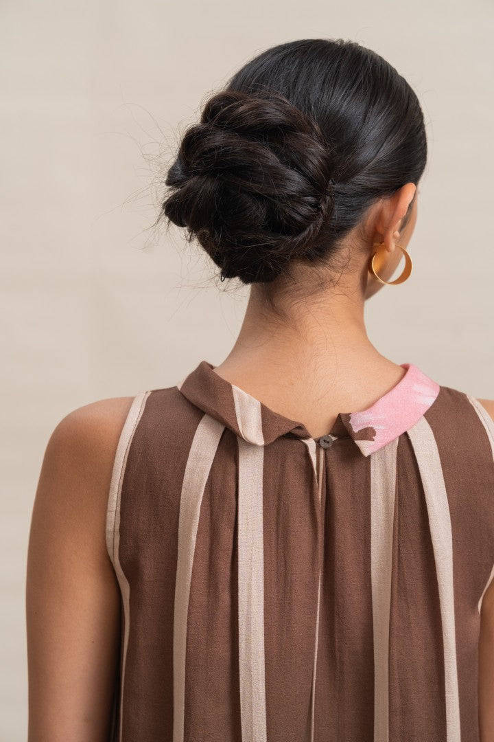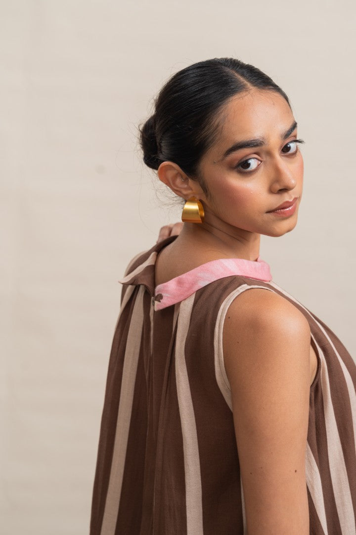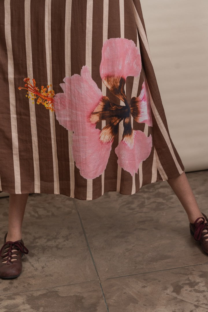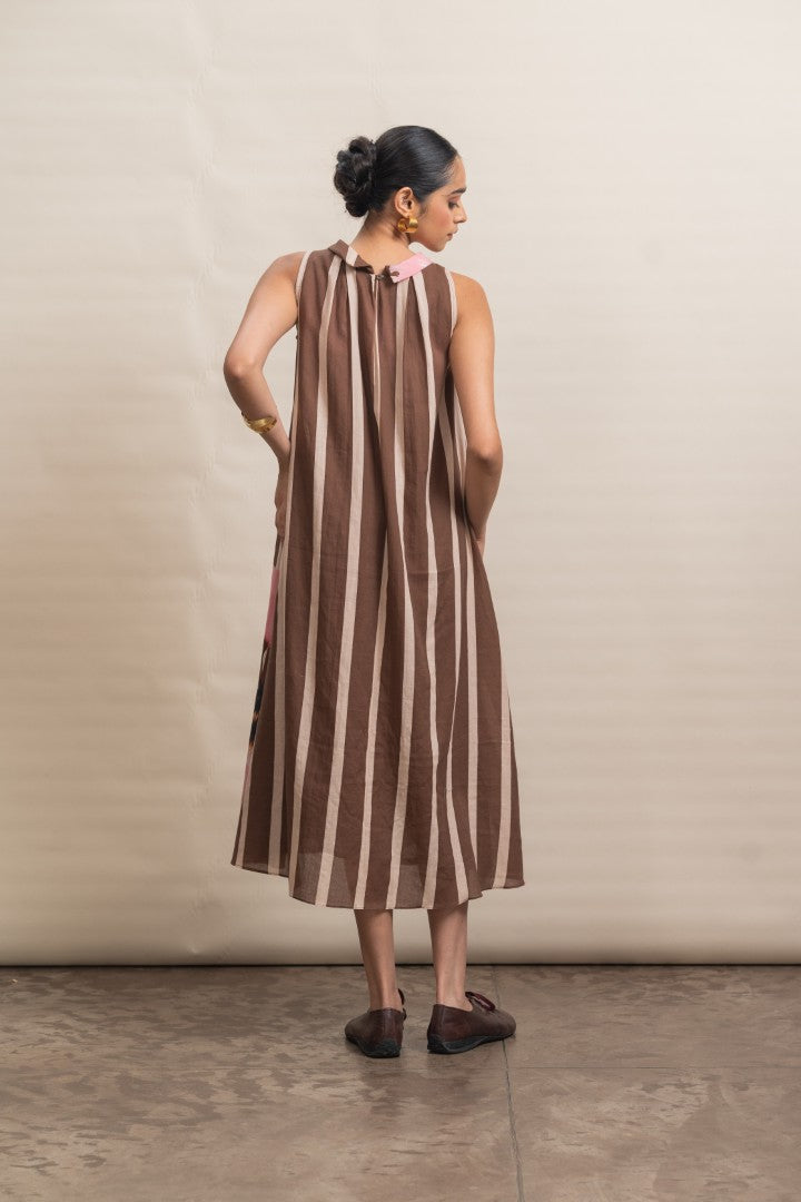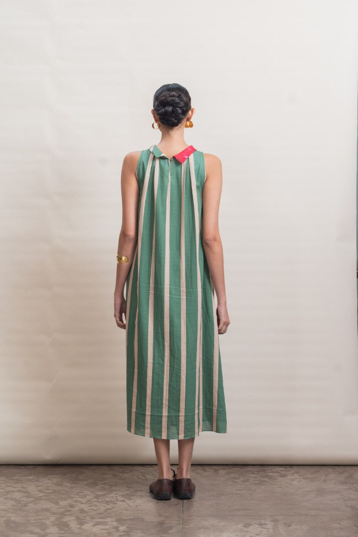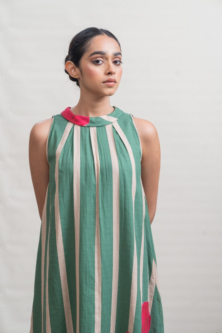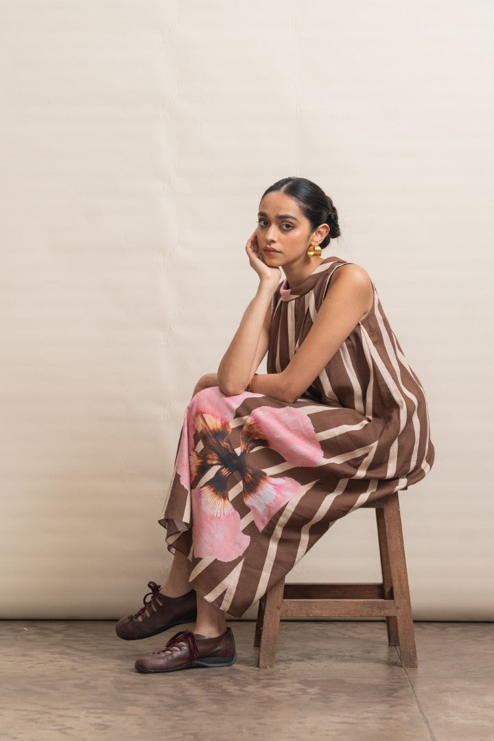 Sleeveless midi dress in soft cotton with vertical stripe placement for a lengthened silhouette. Features a relaxed A-line fall and a hand-painted floral motif print placed at the hem. Finished with a rolled collar and back closure,this dress makes a statement in understated elegance.