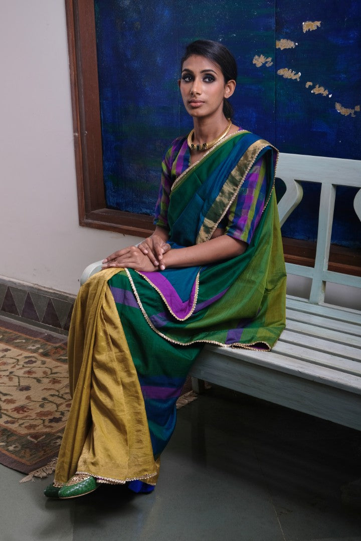 This saree is a play of dualities — minimalism and vibrance woven together. One half unfolds in a serene plain tissue of Zatra Olive, understated yet luminous in its sheen. The other half bursts into bold stripes of teal, Amethyst , and emerald, echoing the spirit of festivity and movement.