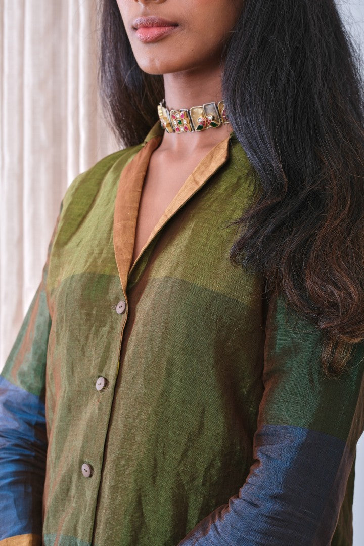 The shimmering fabric catches the light with every movement, while the kasav cuffs and hem lend a regal edge. Style it as a statement coat layered over separates, or wear it as a standalone dress. For a coordinated look, team it with our Zatra Olive Trousers to transform it into a striking set.